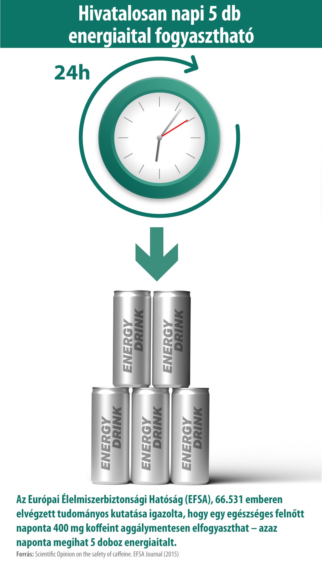 A világ eddigi legnagyobb, 66.531 emberen végzett tudományos vizsgálat alapján az Európai Élelmiszerbiztonsági Hatóság megállapította, hogy egy egészséges felnőtt napi 400 mg koffeint fogyaszthat aggálymentesen. Ez a mennyiség nagyjából 5 doboz (250 ml) energiaital koffein tartalmának felel meg.